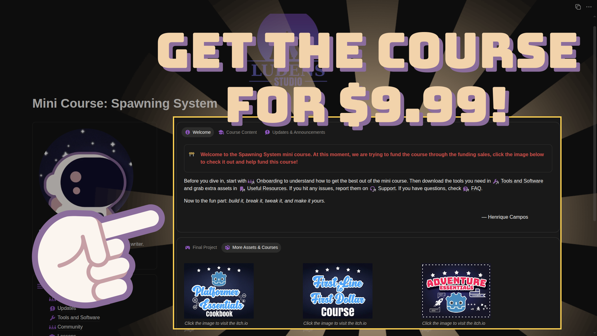 And to help you make the best out of the asset pack once you bring it to your projects, we also offer a practical chapter, which is the actual mini course, on how we used the Spawning Kit to build the the demo you played on this very page. In this chapter you learn some good architecture and overall structures that will help you scale the system and plug it in your own projects.