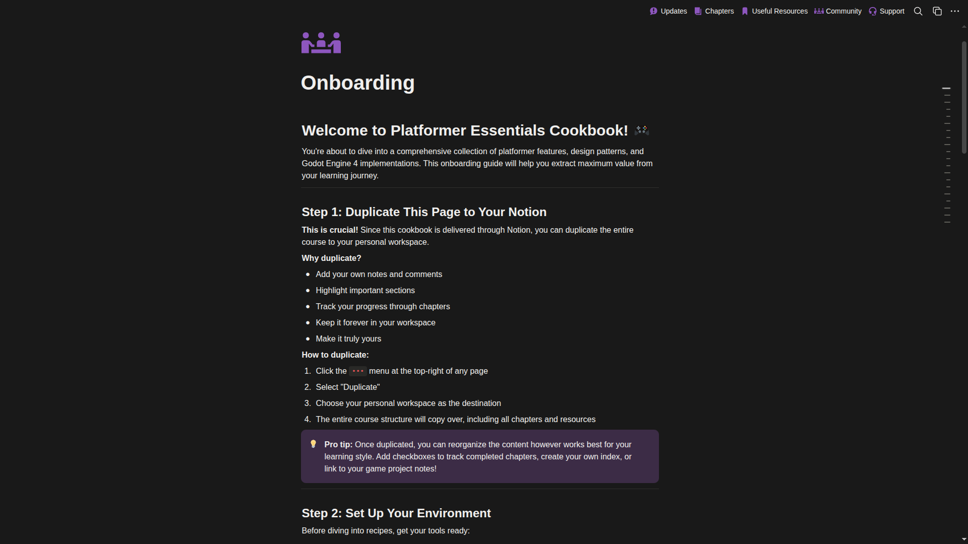 - Yes. The project evolved into Platformer Essentials 2.0 hosted in Notion, with a News & Updates section inside the book and devlogs on itch announcing changes. When you see new devlogs about updated recipes or engine changes, the underlying Notion content has been refreshed as well.