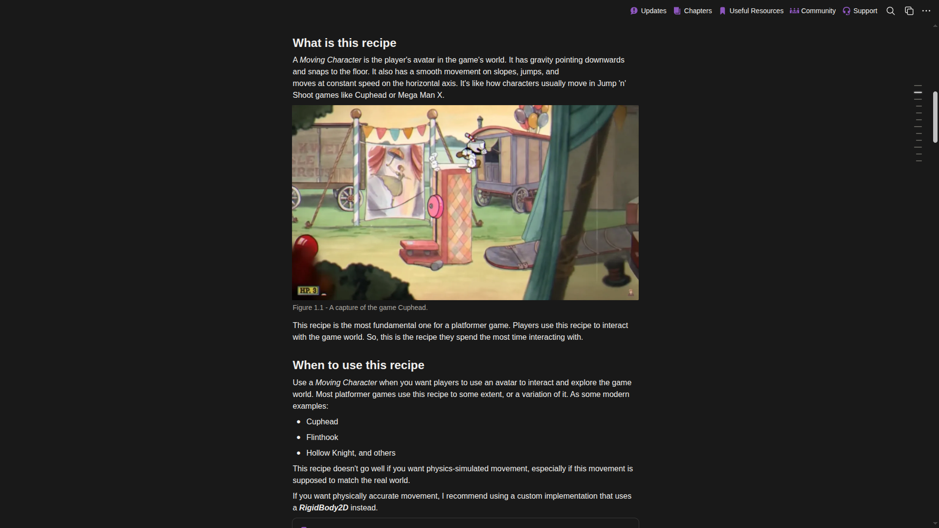 - It goes well beyond a basic controller. The cookbook includes recipes for a moving character, wall jumping, moving platforms, parallax backgrounds, stompable and bumping enemies, interactive areas, portals, switches, checkpoints, a grappling hook, and a boss battle framework. Each chapter is self‑contained so you can pick only what your project needs.