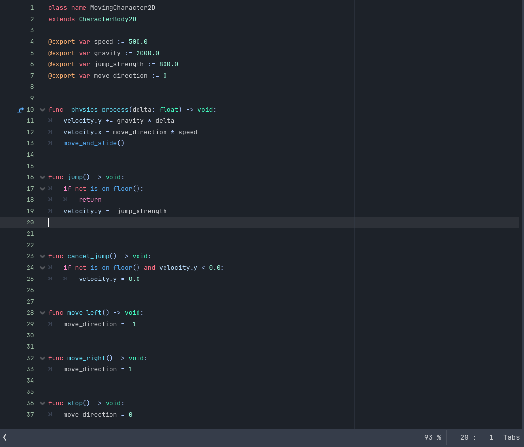 method to constantly update the character movement.func _physics_process(delta) -> void: velocity.y += gravity * delta velocity.x = move_direction * speed move_and_slide()