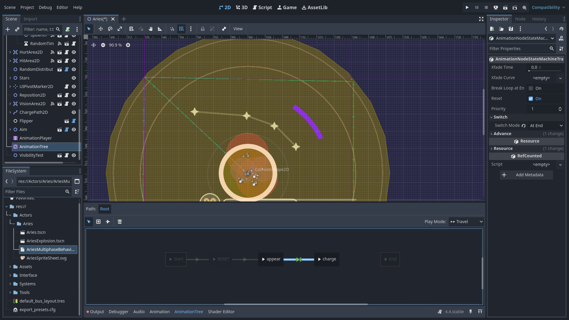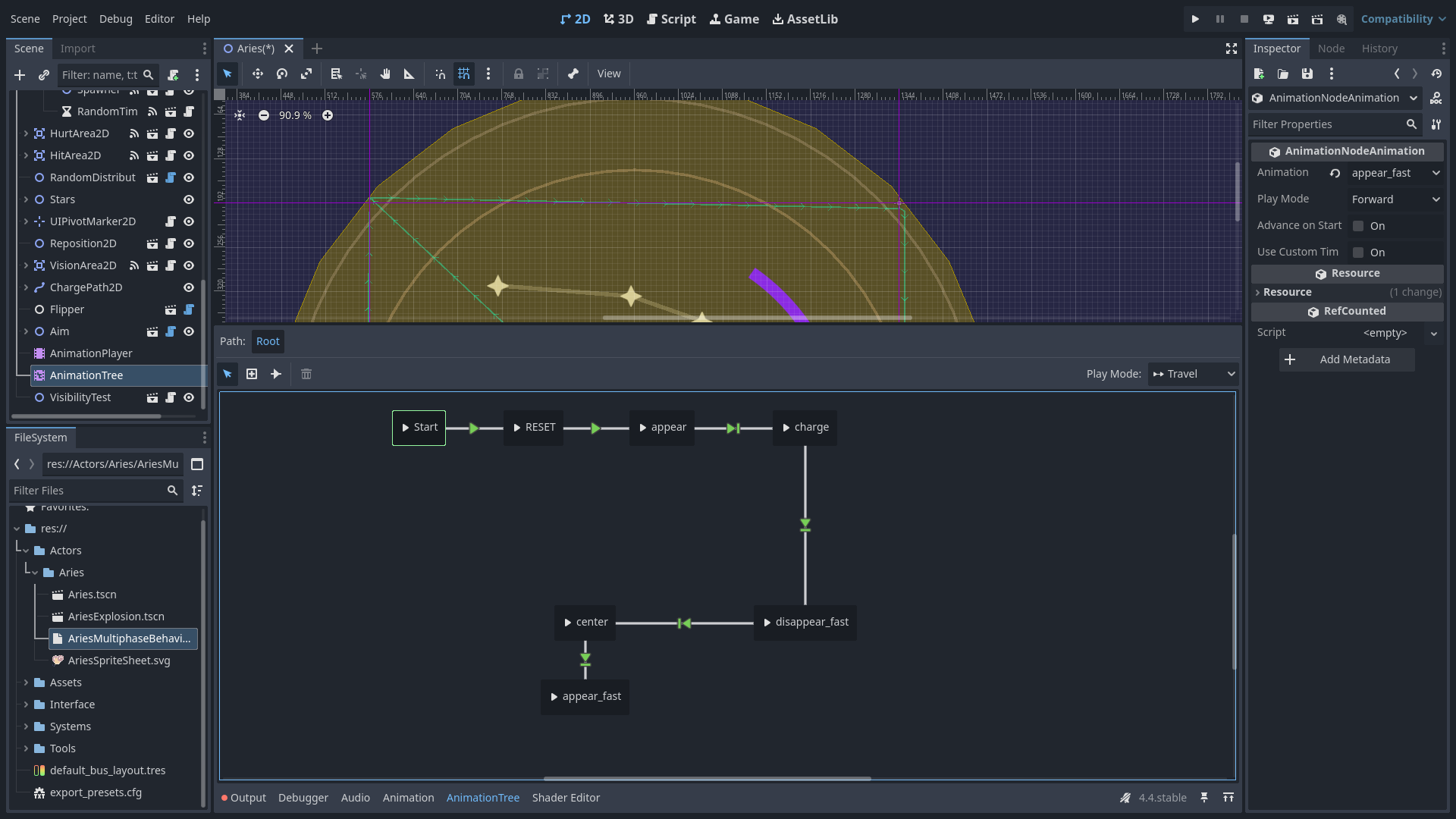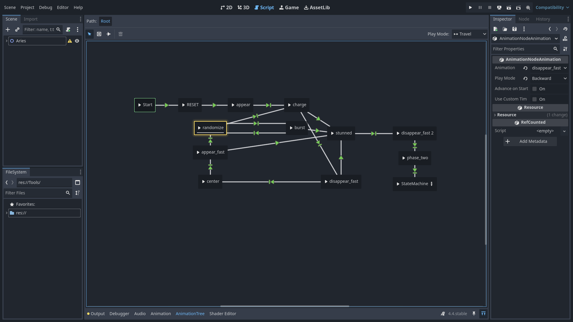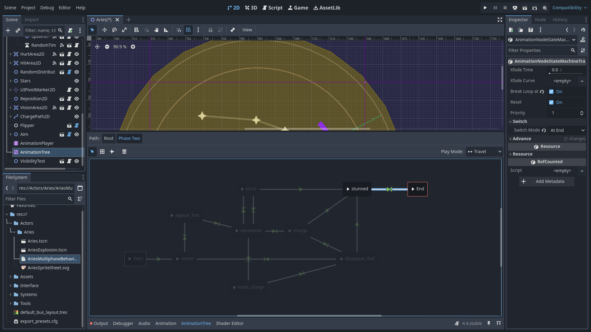 From here, you can play around, just like we did in the first phase. In my case, I used a similar approach, making a loop from appear_fast → randomiz,e then it will either go to the charge, burst, or the new, more aggressive multi_charge animation, where Aries charges in all directions, creating explosions as he moves. From any of these three, he goes to the disappear_fast → center → appear_fast and starts all over.