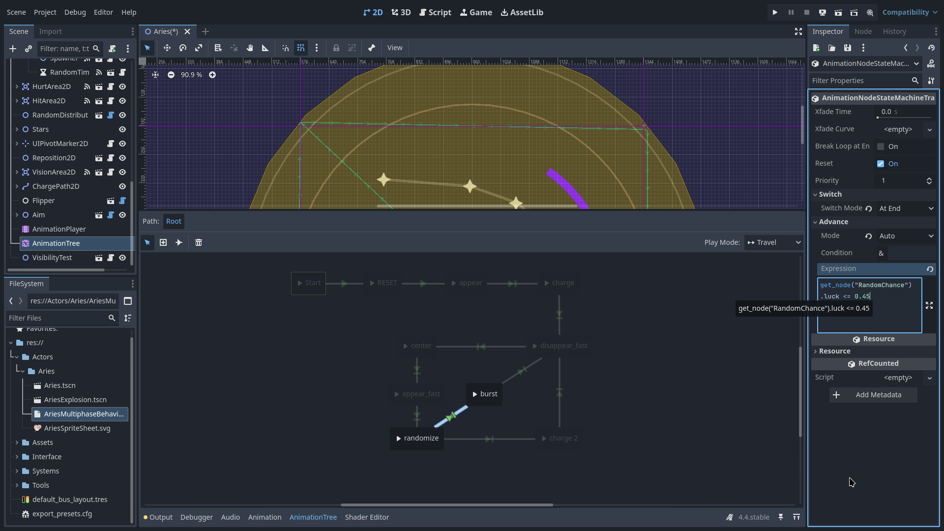 After reappearing, we want to add some variation in Aries’ behavior pattern. He will either burst, spawning some explosions around him for a brief moment, or he will charge again. Let’s say there’s a 40% chance that Aries will burst. How can we implement that in this system? Well, it turns out that I have a component called RandomChance, that is specialized in dealing with lucky and chances. There’s an animation that calls its RandomChance.throw_dice() method, and we can access the RandomChance.luck to check the luck generated. Luck in this context is the chances of any given dice’s face showing up multiplied by the face that actually showed up. So if we are throwing a D20 and the number 20 was randomized, then we had a luck of 1.0, which is 5% (0.05) multiplied by 20.