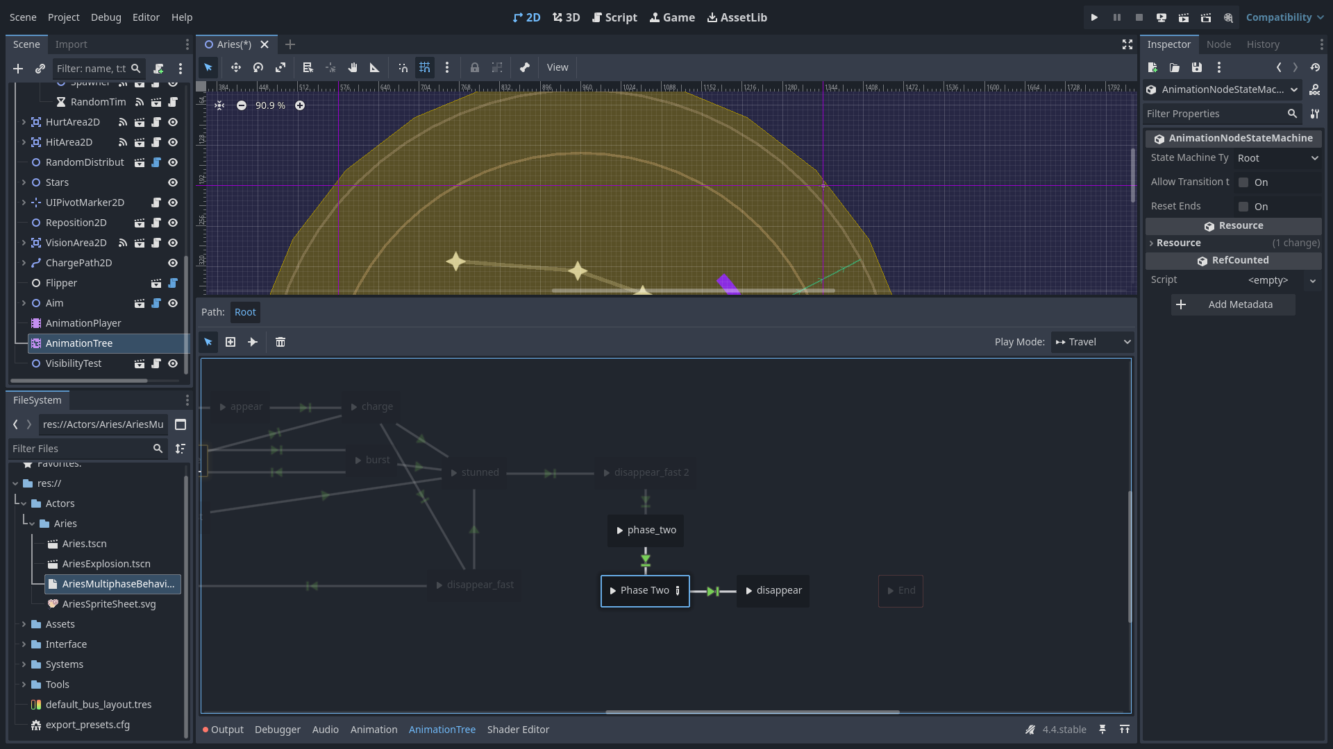 As you can see, if we transit back to the disappear_fast animation from the charge 2 and the burst animations, we create a loop which closes the behavior pattern of our boss' first phase.