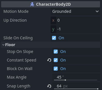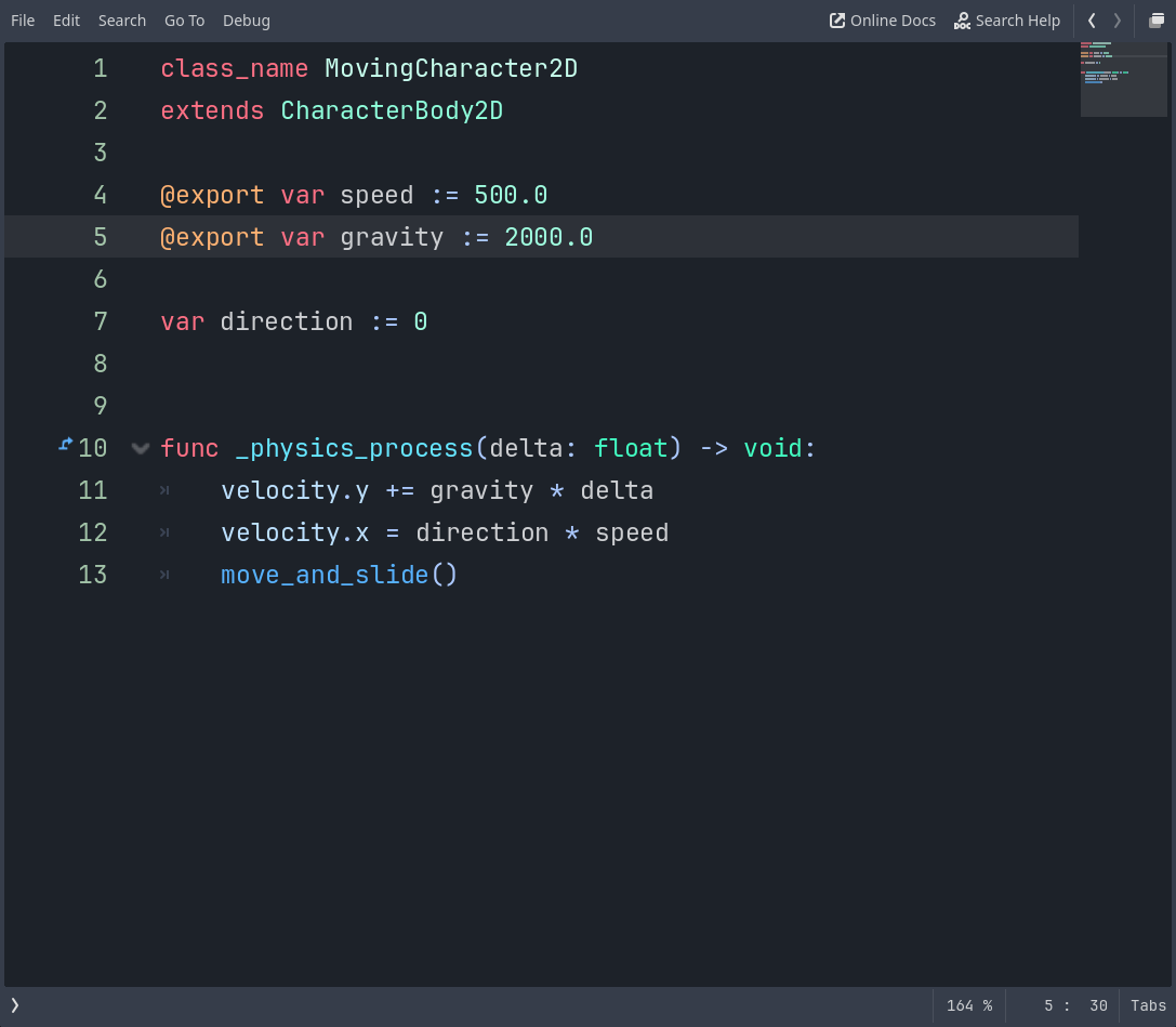 _physics_process()callback, apply gravity to thevelocity.yaxis. For thevelocity.xaxis, multiplyspeedbydirection. - Call the